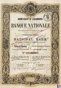 | 3.9.1879 | Modifications des statuts de la société anonyme « Banque Nationale du Grand-Duché de Luxembourg » Le capital social est de fr. 7.500.000, divisés en 15.000 actions en nom ou au porteur, de fr. 500 chacune Conseil d'administration de la Banque Nationale du Grand-Duché de