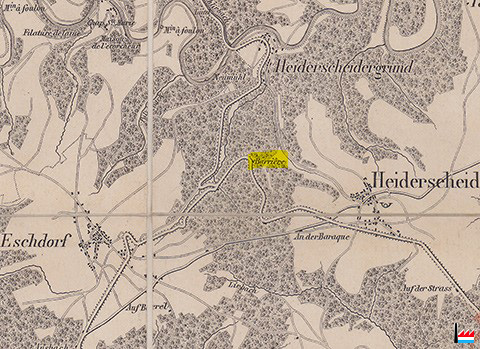 ![]() Barrière tëschend Heischent (Heiderscheid) an Heischtergronn (Heiderscheidergrund) - = Brusselhof ? (Carte Jean-Baptiste Liesch - 1862) |