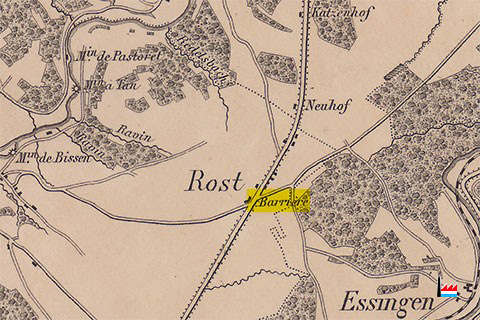 ![]() Roost - Rost-Barrière (Carte Jean-Baptiste Liesch - 1862) Bissen - Neuhof - Essingen - Mersch |
