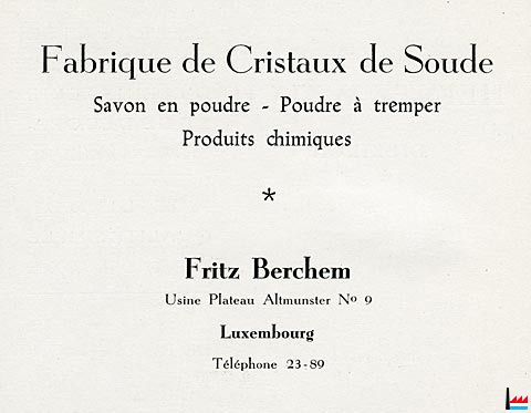 | 1948/53 | Savonnerie / Fabrique de cristaux de soude Berchem Fritz Seifenfabrik + Sodafabrik Fritz Berchem |