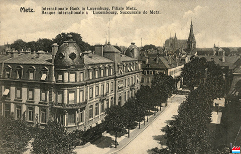 | 1911 | ![]() Banque Internationale à Luxembourg, Succursale de Metz (Carte postale: Verlag G. Scriba, Metz 602 - 1911; Collection: industrie.lu) |