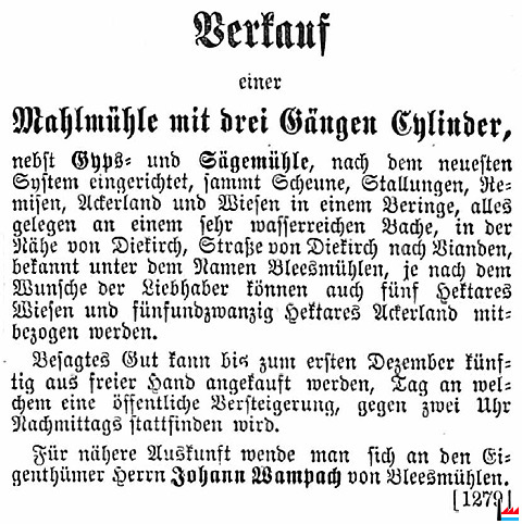 | 1866 | Verkauf Mahlmühle mit 3 Gängen Zylinder, nebst Gipsmühle und Sägemühle durch Johann Wampach, Bleesmühlen |