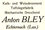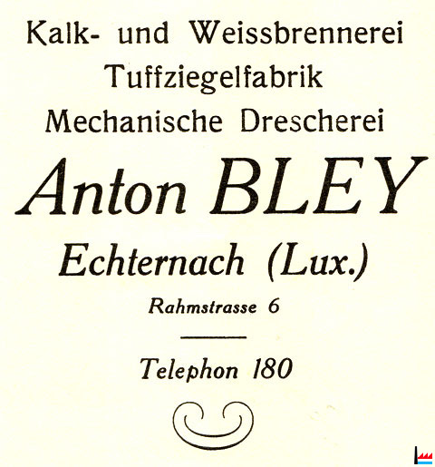 | 1948/49 | Bley Antoine Steinbrüche, Kleinschlag, Splitter, Ziegelei, Tuffziegel, Hohlblöcke Spezialität: Echternacher Weiss und Kalk |