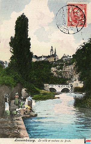 Luxembourg, La ville et rochers du Bock, l'Alzette - à gauche Wäschfra - vers 1912 (Carte postale: O. Schleich, Nachfolger, Dresden, No 3548; Collection: industrie.lu)