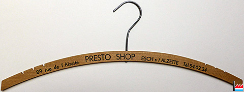 PRESTO SHOP - 89, rue de l'Alzette - Esch/Alzette - Tél. 54.02.34 - Cintre publicitaire en bois (Collection Philippe Aschman) (Collection: industrie.lu)