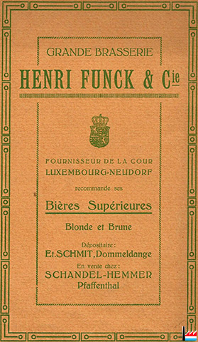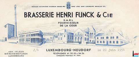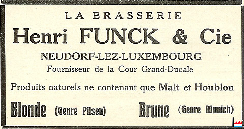 | 1.1.1905 | Brasserie Henri Funck & Cie , Neudorf-lez-Luxembourg Fabrication de bière et toutes opérations s'y rattachant Capital: 1.500.000? francs Associés: Henri Funck et Pierre Funck, tous deux commandités-gérants, Neudorf Société en commandite simple, constituée le 1er janvier 1905 Les deux commandités gérants gèrent sous leur engagement et responsabilité solidaires, la dite société; la gérance traite toutes les affaires sociales; la société n'est engagée que par la signature des deux gérants ; pour tous achats de machines, pour toutes acquisitions, ventes, ou locations d'immeubles, pour toutes constructions ou réparations éventuelles dont le prix dépassera 2000 francs, ils devront avoir l'assentiment du conseil de surveillance (Inscription au registre aux firmes N° 13 - Du 12 mars 1910) |