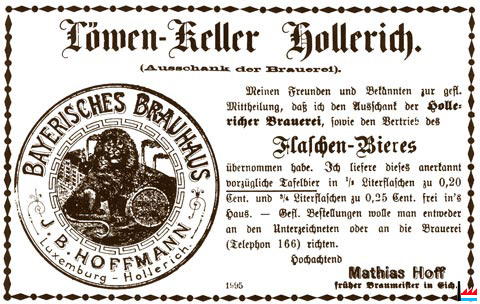 | 1895 | Reprise par Jean-Baptiste Hoffmann "Bayerisches Brauhaus zum Löwenbräu" Débit de la brasserie "Löwen-Keller" dirigé par Mathias Hoff - Kuhnen, ancien maître-brasseur de la Brasserie d'Eich (Dem Herrn Mathias Hoff, Schenkwirth zu Hollerich, geboren zu Mastershausen (Rhein-Preußen) am 18. Februar 1857, wird am 27. Juni 1905 die Naturalisation verliehen) |