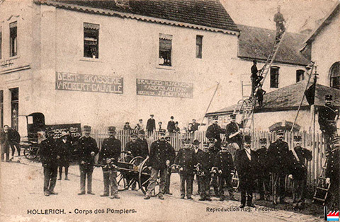 ![]() Hollerich - Corps de pompiers - Débit de la Brasserie Ve Robert Gauvillé - vers 1914 Brauerei H. Jaenisch, Kaiserslautern - Vertreter J.B. Hoffmann |