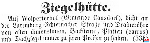| 1855 | Briqueterie au Wolperterhof - Ziegelhütte dicht an der Luxemburg - Echternacher Straße (LW: 21.10.1855) |