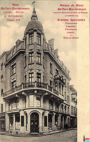 La maison de blanc Beffort - Bandermann, Luxembourg, rues du Gouvernement et du Curé (Mamergaass), construite avec 250.000 briques de Bettembourg et de Trèves (Carte postale: Charles Bernhoeft, Luxembourg Nr.: 442 - vers 1909)