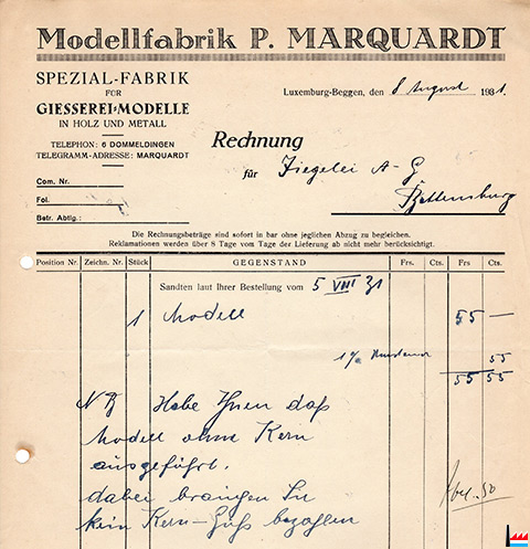 Rechnung der Modellfabrik Paul Marquardt für ein Modell für die Ziegelei A.G. Bettemburg - 1931 (Collection: industrie.lu)