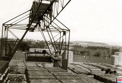 | Die Seilbahn von 70 m Länge transportiert die fertigen Blöcke vom Vibriertisch zum Lager im Freien Abtraggerät von 14 m Breite |
