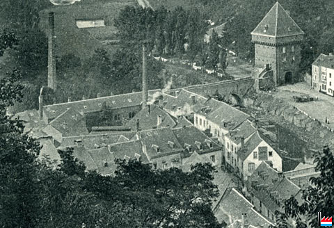 Im Hintergrund die Brückermühle, in der Bildmitte die Brauerei Funck - Nouveau, Pfaffenthal, um 1908 (Postkarte: Gerhard Thies, Elberfeld, Dess. 12875; Collection: industrie.lu)