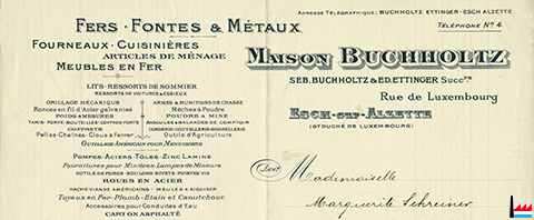 rue de Luxembourg Commerce de fer et quincailerie et autres branches similaires Associés : 1° Séb. Buchholtz fils ; 2° Ed Ettinger et son épouse Marguerite Buchholtz, négociants, Esch-sur-Alz. Société en nom collectif constituée le 10 février 1900 (Registre aux firmes N ° 15 - Du 22 mars 1910) |