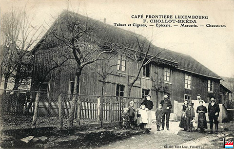 Café Frontière Luxembourg, Hussigny-Godbrange / Differdange - Koihlesgrund / Kuelesgrond - F. Chollot - Bréda (ou Breden ?) - Tabacs et Cigares - Epicerie - Mercerie - Chaussures - vers 1909 - Restaurant Baache Jang, Differdange (Photo: 1.7.2013 jmo)