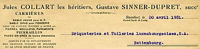 | 1923 | ![]() Jules Collart les héritiers, Gustave Sinner - Dupret succ. Carrières de sable jaune pour HF (hauts fourneaux) sable gras pour fonderie trou de coulée, poches à acier, etc. Pierres, moëllons, parements, pierrailles pavés en grès de toutes dimensions |