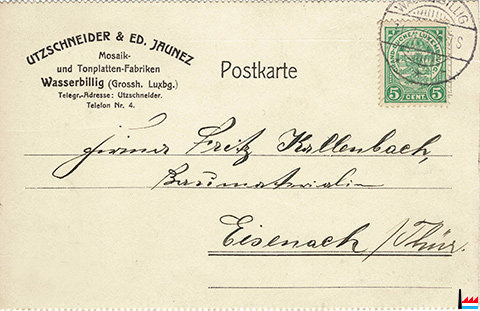 | 31.7.1914 | ![]() Utzschneider et Jaunez, Wasserbillig - Hoffmann (Collection: industrie.lu) an Baumaterialien Fritz Kallenbach, Eisenach / Thüringen |