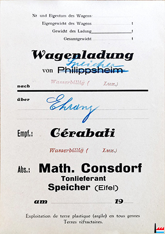 ![]() Frachtbrief - Wagenladung von Speicher nach Wasserbillig (Lux.) über Ehrang (Sammlung: Wilhelm Schommer) Empfänger: Cérabati, Wasserbillig (Lux.) Absender: Mathias Consdorf, Tonlieferant, Speicher (Eifel) Exploitation de terre plastique (argile) en tous genres - Terres réfractaires |