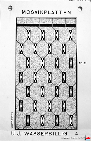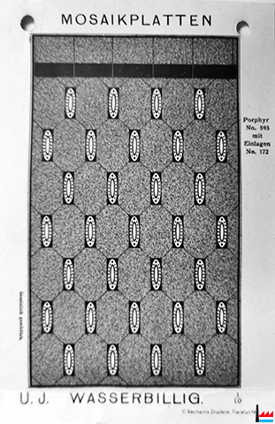 | 1912 | ![]() Mosaïkplatten - Verlegepläne von U.J. Wasserbillig - 1912 (Sammlung: Wilhelm Schommer) N° 171, - Porphyr N° 593 mit Einlagen N° 172 |