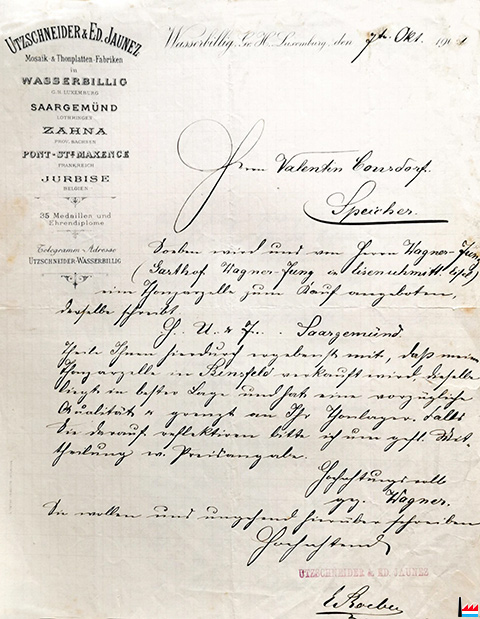 | 15.3.1919 | ![]() Schreiben von Otto Roever-Charton - Utzschneider & Ed. Jaunez, Wasserbillig an Valentin Consdorf, Speicher: Lageplan zu einem am 11.3.1919 bestellten Plattenbelag - 15.3.1919 (Sammlung: Wilhelm Schommer) |