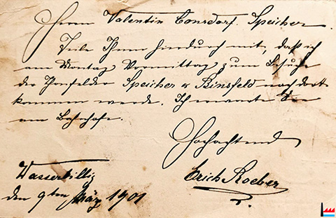| 9.3.1901 | ![]() Postkarte von Utzschneider & Jaunez, Wasserbillig an Valentin Consdorf, Speicher - 9.3.1901 (Sammlung: Wilhelm Schommer) ![]() Unterschrift: Erich Roeber |