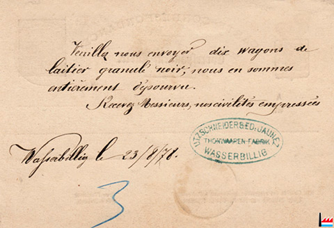 postale du 23.78.1878 de la Thonwaaren-Fabrik Utzscheider & Ed. Jaunez, Wasserbillig an Metz & Cie, Dommeldange (Collection: industrie.lu)