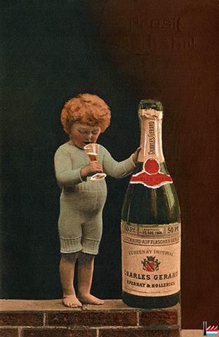 Dem Etikett der Champagnerflasche auf der obigen Neujahrspostkarte zufolge füllte CHARLES GERARD aus Epernay (Champagne / Frankreich) um 1904 in Hollerich (Luxemburg-Bahnhof) Champagner (Verzenay Impérial) ab. Wir haben auch keine weiteren Hinweise auf die Aktivitäten der Champagnerfabrik CHARLES GERARD in Hollerich / Luxemburg gefunden. Das Etikett sieht ziemlich echt aus, oder ist es reine Phantasie?