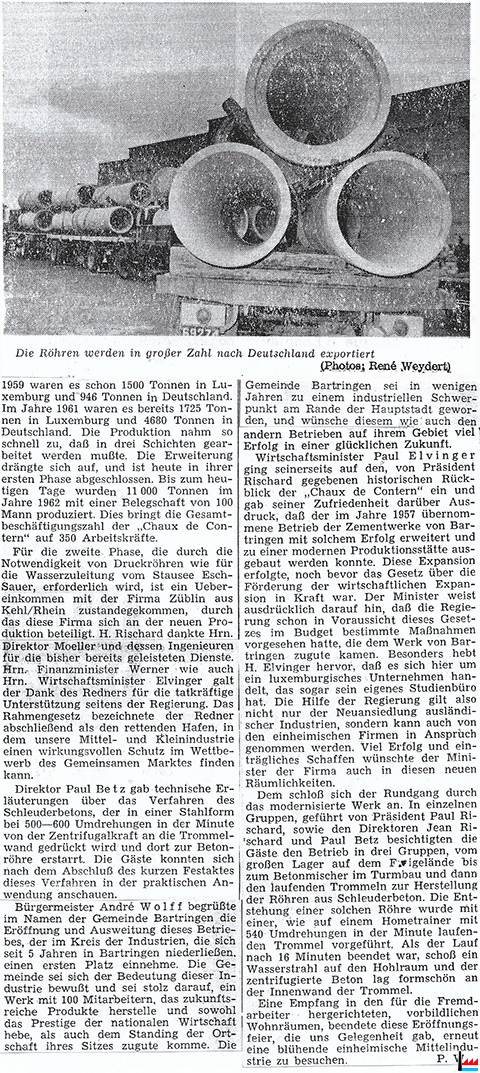 | 1960 | Arbeitsgemeinschaft zwischen Chaux de Contern und Züblin GmbH in Kehl / Rhein zum Bau der Fernwasserleitung vom Stausee in Esch/Sauer |