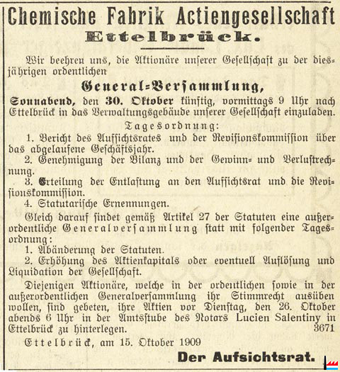 Urkunden ergibt. Comparenten : I . Hr. Richard Rheinberger, Chemiker zu Leipzig-Plagwitz, Giesserstrasse Nr. 48 wohnend, verfahrend in persönlichem Namen ; II. Hr. Dr jur. Franz Mongenast, Advokat in Diekirch, in Ettelbrück wohnhaft, handelnd in seiner Eigenschaft als Spezialbevollmächtigter a) des Hrn. Otto Schultz, Kaufmann, wohnhaft in Leipzig, Prendelstrasse, Nr. 4 ; b) des Hrn Max Goedike, Banquier in Roda, Sachsen-Altenburg, wohnend ; c) als Spezialbevollmächtigter des Hrn. Georg Hufner, Kaufmann in Leipzig-Gohles, Wilhelmstrasse, Nr. 12 wohnhaft. Unter der Firma « Chemische Fabrik Actien-Gesellschaft Ettelbruck » (Société anonyme pour la fabrication de produits chimiques à Ettelbruck) wird hiermit zwischen den Comparenten Hrn. Richard Rheinberger und dem obgenannten Franz Mongenast, verfahrend in. seiner besagten Eigenschaft, und allen denjenigen, welche den gegenwärtigen Statuten durch Erwerb von Actien beitreten, eine anonyme Gesellschaft gegründet. Der Sitz der Gesellschaft ist in Ettelbrück. Der Verwaltungsrat hat das Recht, in und ausserhalb des Grossherzogtums Zweigniederlassungen zu errichten. Gegenstand des Unternehmens ist die Fabrikation und der Verkauf von chemischen Artikeln aller Art sowie die Herstellung der dazu notwendigen Verpackungen eventuell auch der Verkauf solcher Verpackungen. Die Gesellschaft kann sich bei andern gleichartigen Unternehmungen beteiligen, sei es durch gemeinschaftlichen Betrieb oder durch Kapital-Einlage, sei es durch Uebernehmen von Actien anderer Gesellschaften oder durch vertragsmässige Participation am Gewinn oder Verlust oder sonstwie. Das Grundkapital beträgt vierzig tausend Franken, eingeteilt in vierzig Actien Nummer eins bis vierzig, jede von tausend Franken ; diese vierzig Actien sind von den vier vorbenannten Gesellschaften ad pari übernommen worden und zwar : zehn Actien von dem Comparenten Franz Mongenast für Rechnung seines Mandanten Hrn. Otto Schultz ; zehn Actien von demselben für Rechnung seines Mandanten Hrn. Georg Hufner ; zehn Action von demselben für Rechnung seines Mandanten Hrn. Max Goedike ; endlich zehn Actien vom Comparenten Richard Rheinberger. Alle diese Actien sind voll bezahlt und wurde der Betrag derselben unter die Hände des Hrn. Rheinberger eingezahlt. Eine Erhöhung des Grundkapitals kann nur auf einem gemäss Art. 27 gefassten Beschluss einer ausserordentlichen Generalversammlung stattfinden. Dieselbe Generalversammlung beschliesst über alle Modalitäten der neu auszugebenden Actien, insbesondere auch über den Ausgabepreis, der zum mindesten so hoch wie der Nennwert bemessen werden muss. Die neuen Actien sind in erster Linie den alten Actionären im Verhältnis ihres Actienbesitzes anzubieten. Die Actien sind nominativ. Jede Actie wird mit einer laufenden Nummer versehen und von zwei Mitgliedern des Verwaltungsrates, oder von einem Mitgliede des Verwaltungsrates und einem Mitgliede der Revisionskommission unter Vordruck der Firma, unterschrieben. Die Dividendenscheine und Talons werden in derselben Weise wie die Actien, jedoch vermittels Facsimile, unterzeichnet. |
