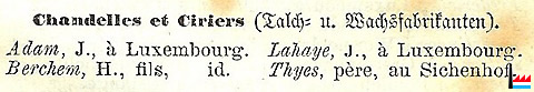 1857 - Chandelles et ciriers: Adam J., Berchem, H., fils, Lahaye J., Thyes, père. (Source: Almanach du Commerce du Grand-Duché de Luxembourg par N.C., 1re année, 1857, Luxembourg, Heintzé Frères, Libraires-Éditeurs, page 21; Collection: famille Aschman-Bodson)