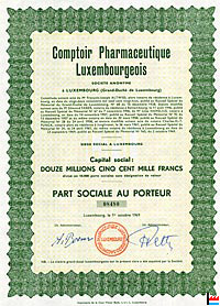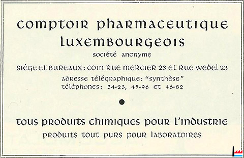 | 1973 | Capital : 12.500.000 francs (10.000 parts sociales) Conseil d’administration M. Pierre Feltes, directeur, Luxembourg Commissaires M. Jules Moitzheim, pharmacien, Luxembourg (Annuaire des sociétés anonymes du Grand-Duché de Luxembourg, XIIe édition, 1973, publié par la Banque internationale à Luxembourg S.A.) |