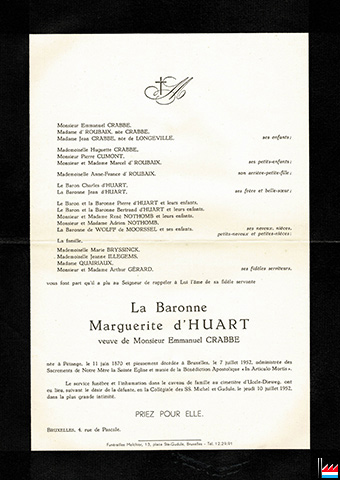 | 7.7.1952 | ![]() Décès de la Baronne Marguerite d'Huart (* 11.6.1870 Pétange; + 7.7.1952 Bruxelles), veuve de Emmanuel Crabbe (Collection: industrie.lu) Monsieur Emmanuel CRABBE Madame d'ROUBAIX, née CRABBE Madame Jean CRABBE, née de LONGEVILLE, ses enfants Mademoiselle Huguette CRABBE Monsieur Pierre CUMONT Monsieur et Madame Marcel d'ROUBAIX, ses petits-enfants Mademoiselle Anne-France d'ROUBAIX, son arrière-petite-fille Le Baron Charles d'HUART, La Baronne Jean d'HUART, ses frère et belle-soeur Le Baron et la Baronne Pierre d'HUART et leurs entants, Le Baron et la Baronne Bertrand d'HUART et leurs entants, Monsieur et Madame René NOTHOMB et leurs entants, Monsieur et Madame Adrien NOTHOMB, La Baronne de WOLFF de MOORSSEL et ses enfants, La famille, Mademoiselle Marie BRYSSINCK, Mademoiselle Jeanne ILLEGEMS, Madame QUAIRIAUX, Monsieur et Madame Arthur GERARD, |