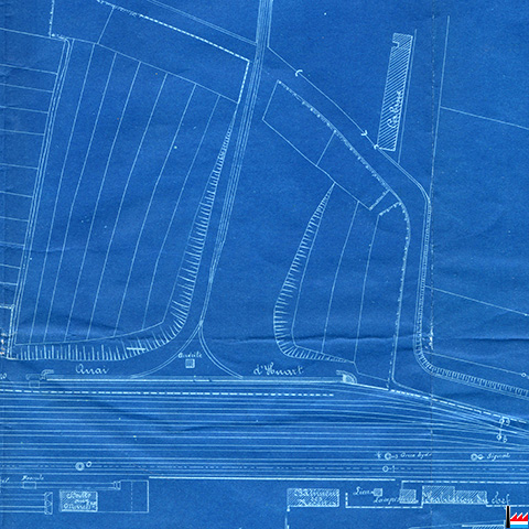 Quai d'Huart, Pétange - vis-à-vis de la Halle aux marchandises et du premier Bâtiment des recettes - Plan: 1.5.1896 (Collection: Fernand Keiser)