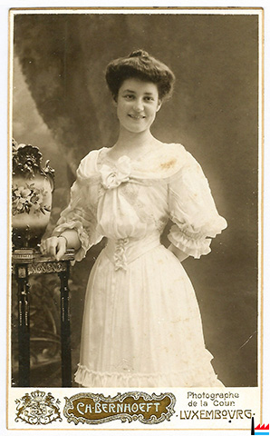 | Vers 1905 | ![]() Marie (Mariechen) de Muyser, née le 18 janvier 1886 à Luxembourg, fille de Constant de Muyser (1851 - 1902) et d’Élise Klein (1860 - 1939), sœur d’Ernest (1883 - 1967) et de Constant (Cosy) (1888 - 1960). - (Photo : Ch. Bernhoeft, Luxembourg, coin rue de l’Arsenal et boulevard Royal, maison fondée en 1878. - Archives privées Guy de Muyser, Luxembourg) |
