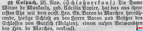 | 1908 | ![]() Rachat du Château de Colpach de Mme Munkacsy, née Cécile Papier, par le Baron de Wykerslooth de Guirsch (LV: 27.11.1908 p. 2) |