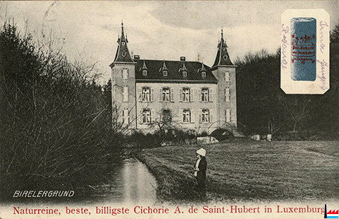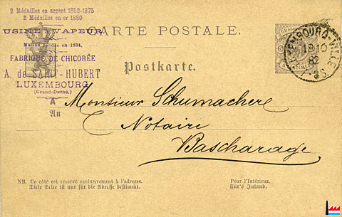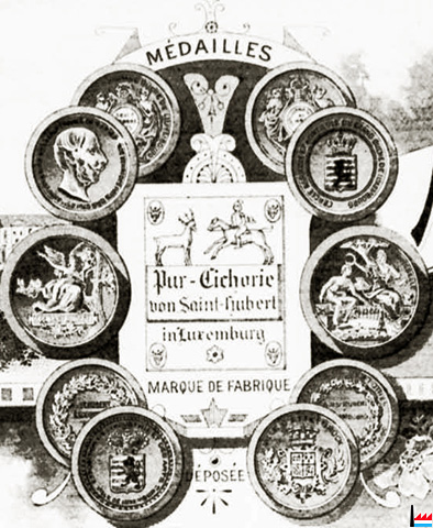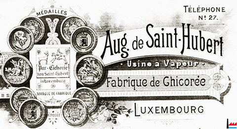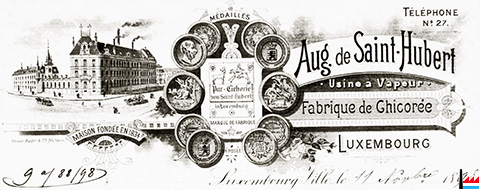 | 1882 | ![]() Carte postale de la Fabrique de chicorée A. de Saint-Hubert, Luxembourg au Notaire Schumacher, Bascharage - 18.10.1882 (Collection: industrie.lu) Usine à vapeur Maison fondée en 1834 Fabrique de chicorée A. de Saint-Hubert Luxembourg 2 Médailles en argent 1852-1875 2 Médailles en or 1880 |