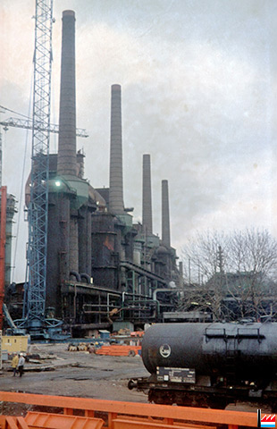 Hüttenwerk Dillingen: im Vordergrund die Baustelle für den neuen Hochofen 4, angeblasen 1974, 3000 ta/to Roheisen, inzwischen modernisiert und vergrößert. Dahinter die ältere Hochofengruppe, die in den 1960er Jahren von Dingler/Zweibrücken gebauten Hochöfen 1-3 (Photo: Ulrich Deuchler)