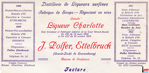 Grande Liqueur Charlotte seul inventeur et fabricant autorisé de la Cour Grand-Ducale N° 150 du 13.3.1909 et N° 422 du 10.10.1919 |