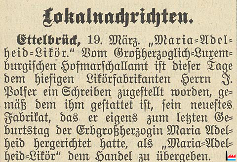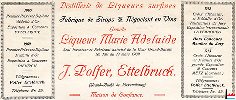 Grande Liqueur Marie Adelaide seul inventeur et fabricant autorisé de la Cour Grand-Ducale N° 150 du 13.3.1909 |