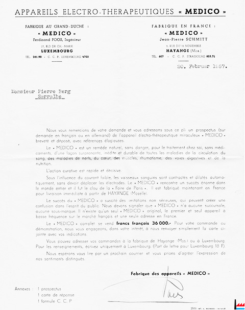 Courrier Appareils électro-thérapeutiques MEDICO, Luxembourg - Hayange - 20.2.1957 (Scan: Bernard Petitdant)