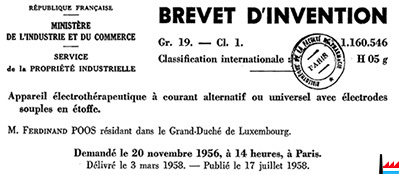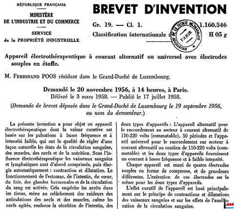 | 17.7.1935 | Brevet d'invention N° 21653 - Appareil électro-thérapeutique à faible consommation (dénommé Electro-Vox) POOS Ferdinand, Luxembourg |