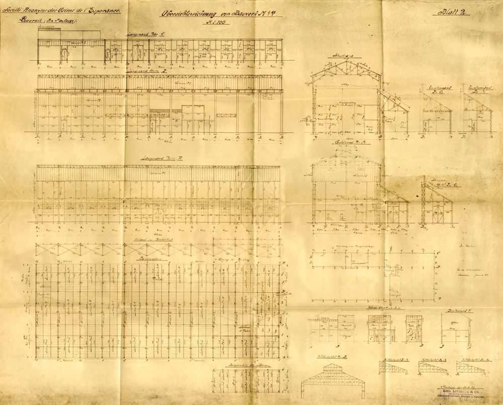 War es sicher eine Halle vom Standort der Société Anonyme des Usines de l'Espérance in Louvroil oder kann es auch eine von der Société Anonyme des Usines de l'Espérance in Louvroil gebaute/geplante Halle gewesen sein die anderswo stand? Wäre es zur Klärung dieser Frage möglich Detailscans von den Beschriftungen oben links und unten rechts vom Plan, so wie Bilder der Halle am Ursprungsstandort zu erhalten?
