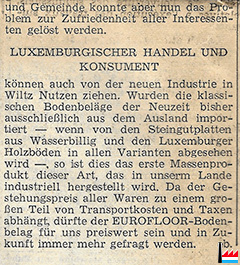 | 9.1961 | ![]() Industrieller Aufbau in Wiltz (frühere Ideal-Gerberei) - Eurofloor - Circuit Foil - Manuwil - Peausserie Ardennaise (LW: 11.9.1961 p. 9; scan: Fernand Toussaint) |