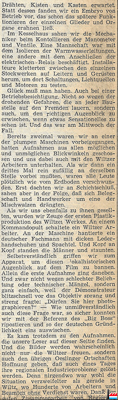 ![]() ![]() ![]() ![]() Die junge Eurofloor macht ihre ersten Gehversuche - Ein Besuch in der neuen Plastikfabrik zu Wiltz (LW: 22.2.1962 p.11; scan: Fernand Toussaint) ![]() Der Verladekran hinter dem Ideal-Gebäude hat in den letzten Monaten zahlreiche schwere Maschinen von den Fernlastern gehoben. Jetzt drehen sich bereits die Walzen und Räder im Innern der Hallen, und die Rauchfahnen auf den Schloten sind den Wilzern ein Symbol des Aufblühens ihrer Industrie, (LW: 22.2.1962 p.11; scan: Fernand Toussaint) |