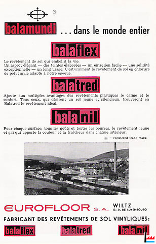 | 1968 | Les Balaflex et Real (revêtements de sols entièrement vinyliques qui se composent d'un film d'usure en vinyl transparent, imprimé sur sa face inférieure et soudé à chaud sur le nombre convenable de sous-couches vinyliques colorées dans la masse) représentent 57%, les Balatred (des revêtements de sols vinyliques avec support en thibaude de jute) 35% et les Balanil (des produits plus directement dérivés du Balatumet sont composés d'un film vinylique transparent imprimé sur sa face interne) 8% de la production d'Eurofloor. | ||