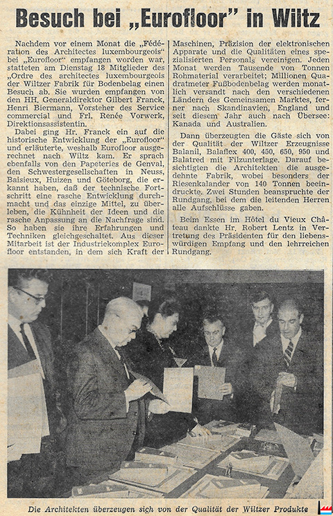 | 17.11.1964 | ![]() Besuch des Ordre des architectes luxembourgeois bei Eurofloor, Wiltz (LW: 21.11.1964; p. 15; scan: Fernand Toussaint) |