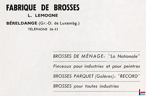 | C’est ainsi qu’à partir de 1937, une activité commerciale, la vente en gros vient s’ajouter à l’activité industrielle. D’abord complémentaire par l’adjonction de la brosserie fine, et ensuite supplémentaire par l’adoption de tous articles ménagers (pas les produits) et les paillassons. | |||