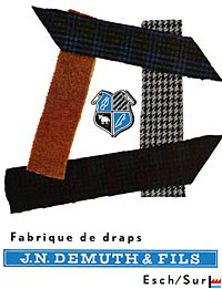 | 1.1.1935 | Fondation: Fabrique de draps DEMUTH FRERES & Fils par Jean-Nicolas Demuth, Ewald Demuth - Greisch (fils de Jean-Nicolas Demuth), et Paul Lesch - Demuth (gendre de Jean-Nicolas Demuth) Capital: 400.000 francs |