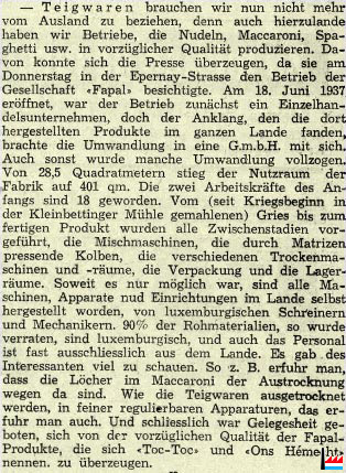 | 9.1948 | LA FAPAL - FABRIQUE DE PATES ALIMENTAIRES, LUXEMBOURG, 4 rue d'Epernay, reprendra sous peu sa fabrication avec tes machines les plus modernes (t: 17.9.1948) |