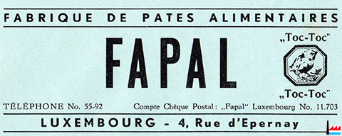 1937 Fapal, Société luxembourgeoise de pâtes alimentaires, Luxembourg Produits : Pâtes alimentaires. |